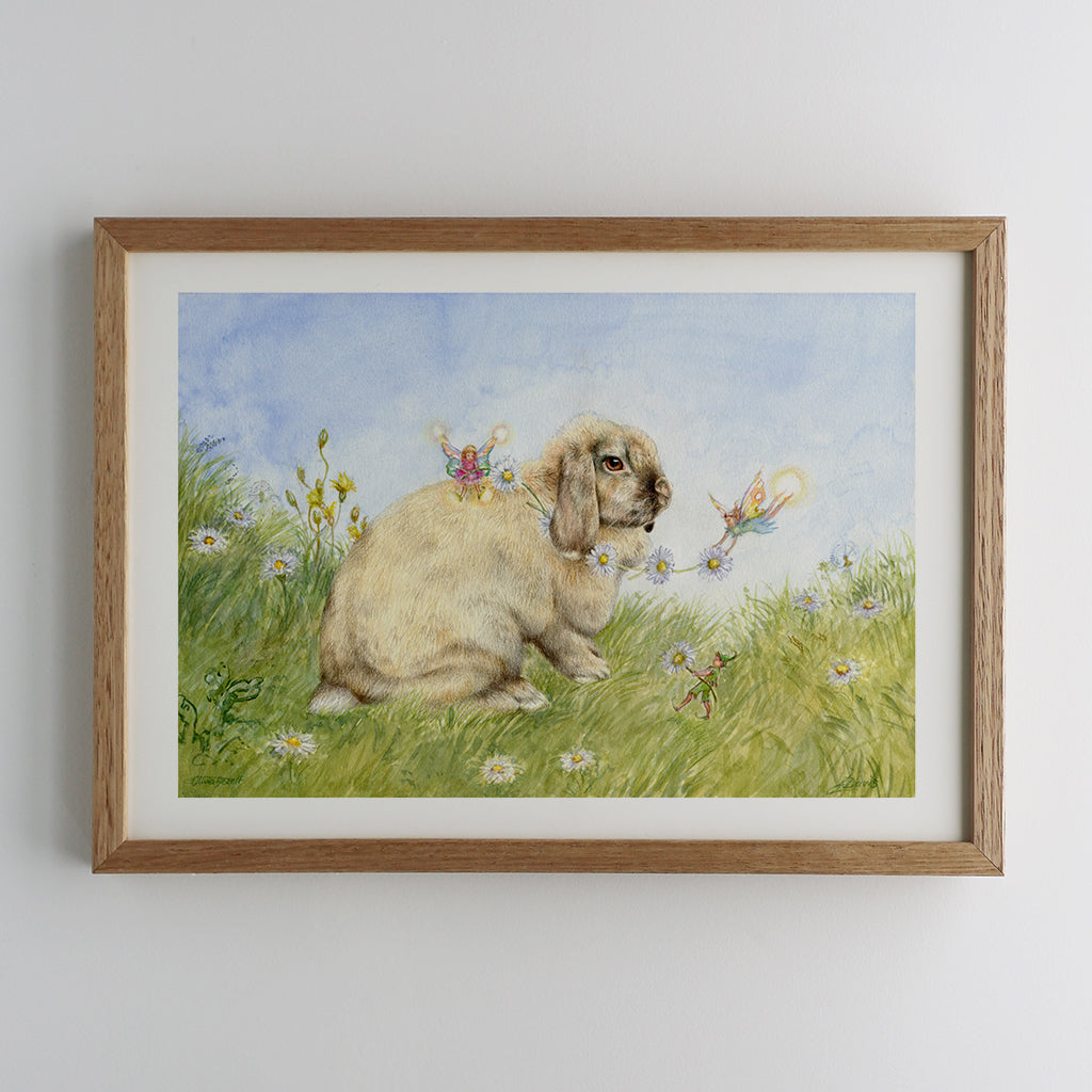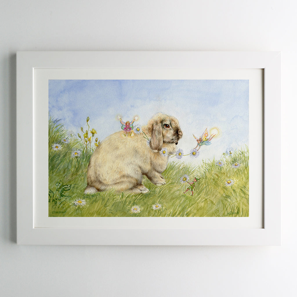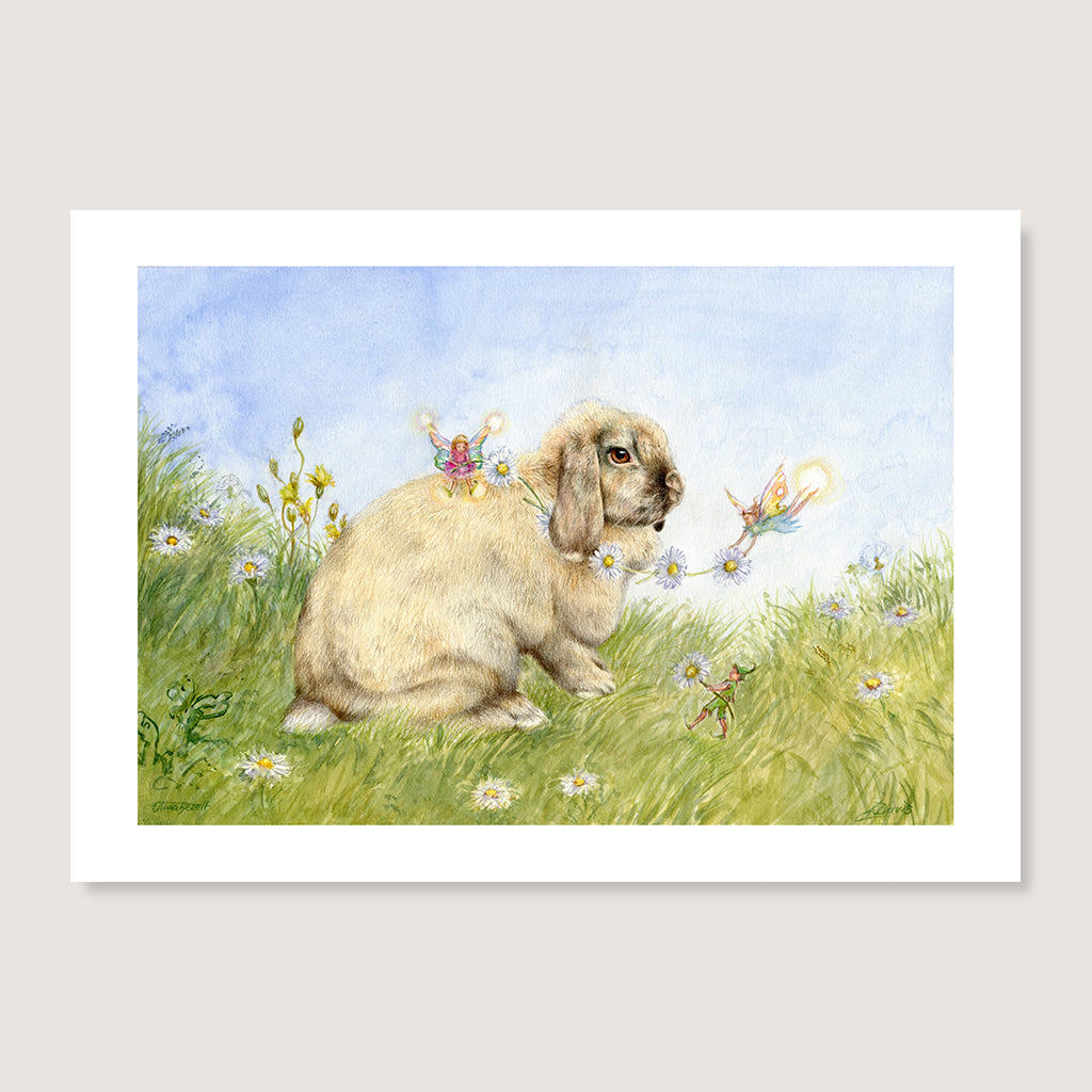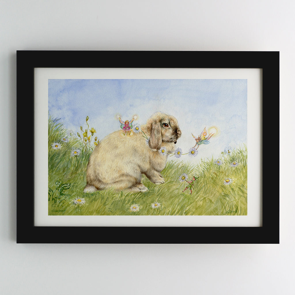 This is a combined artwork by two artists, mother and daughter duo Josephine Davis and Olivia Bezett. Olivia did the rabbit in colored pencils, while Jo did the background/fairies using watercolor.