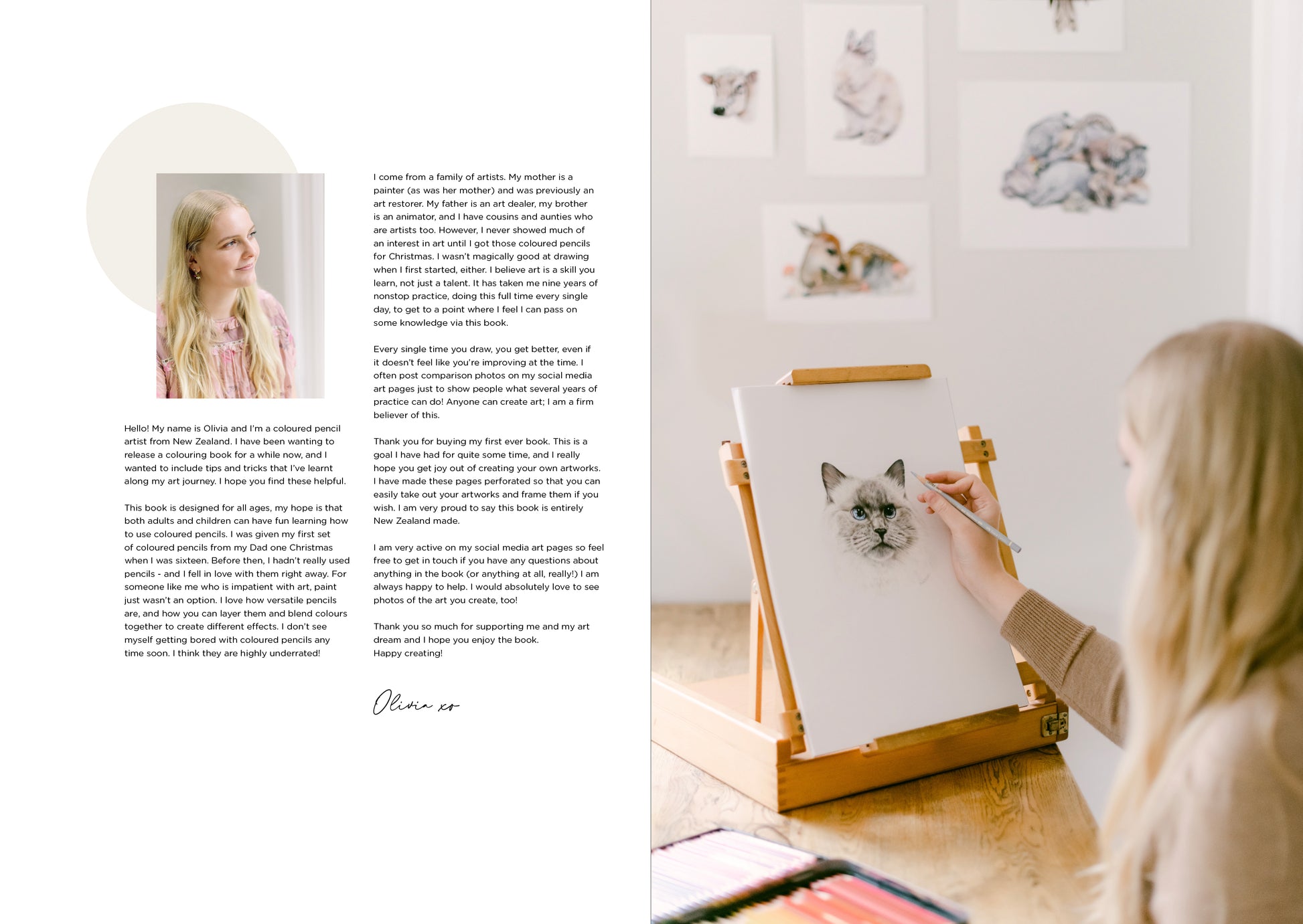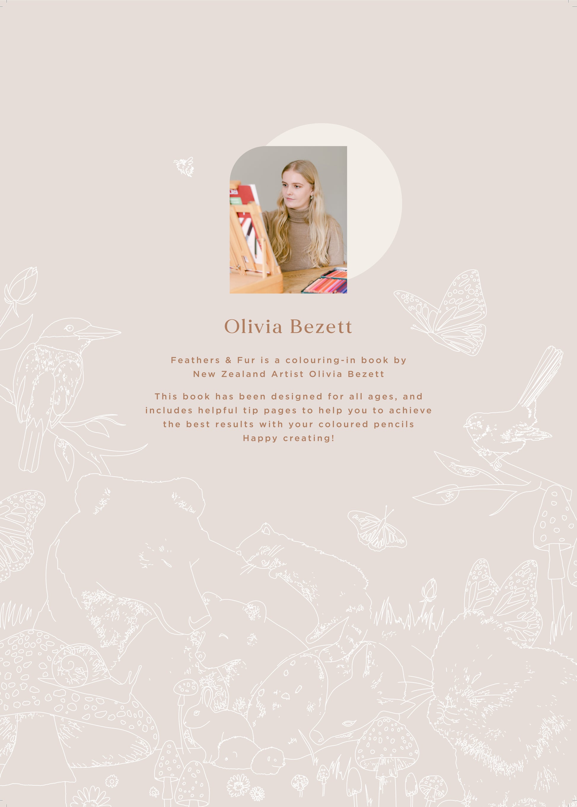 This book is entirely NZ made - which was an expensive decision, but one that I am incredibly proud of. The book contains a few helpful 'tip' pages to pass on some of my coloured pencil knowledge, an 'about the artist' page, and 50 colouring in pages which are outlines of some of my favourite artworks. The pages have been perforated so you can easily remove them if you like! I have made sure the outlines are a nice light grey, and thin, so that you can still see them - but you can achieve a realistic look with the end product, rather than having harsh thick black lines.