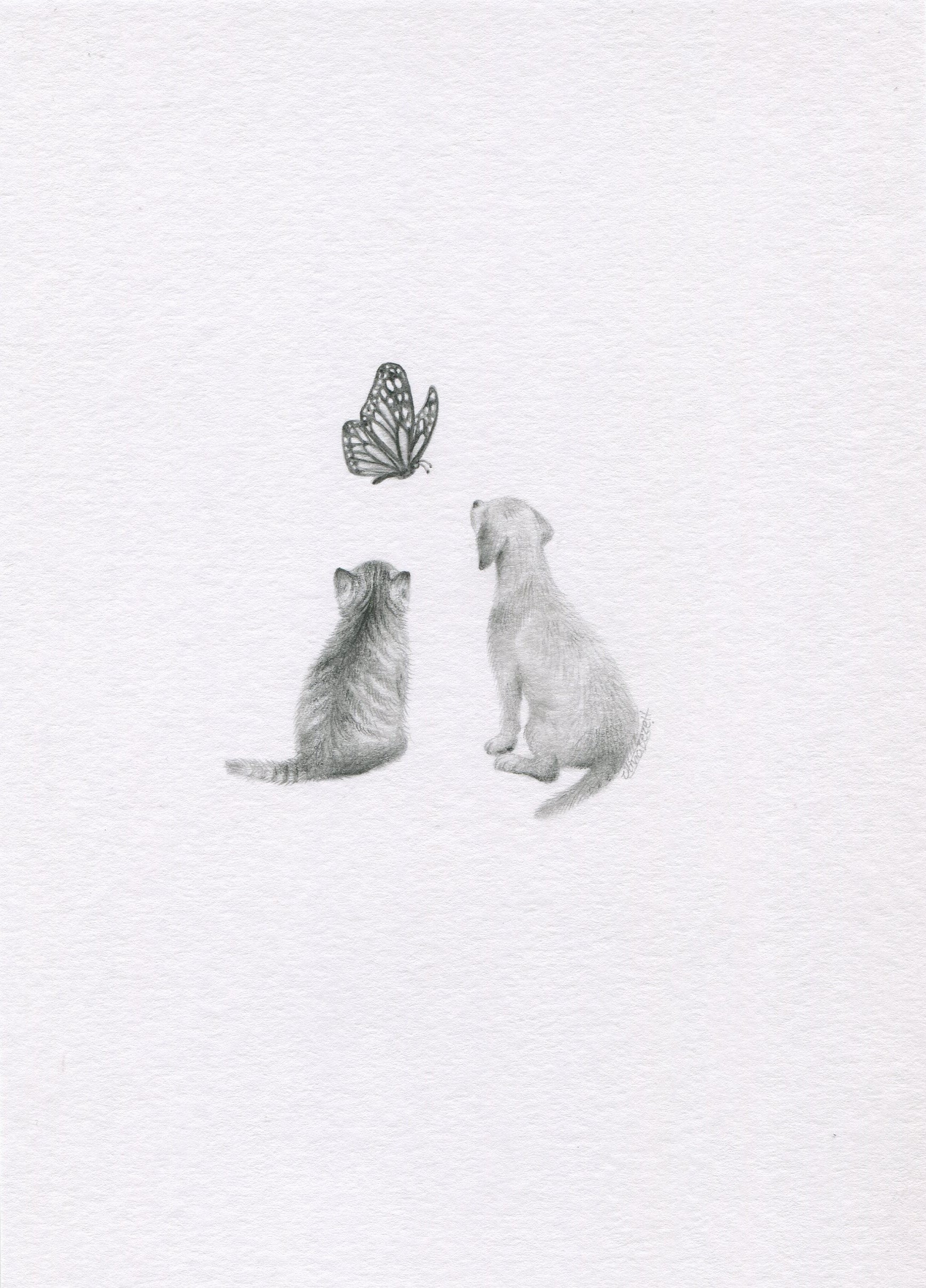 Mini one-off original 'Kitten, Puppy and Butterfly'